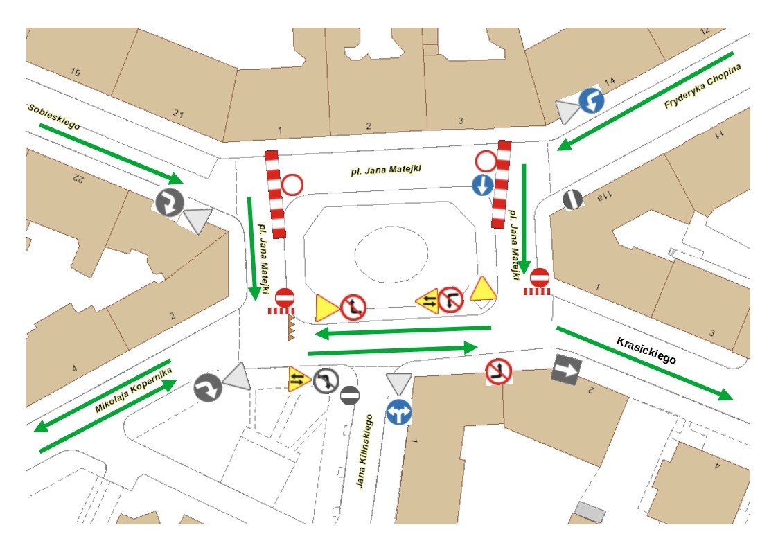 4. Na południowej jezdni placu Matejki od ul. Kopernika do ul. Krasickiego będzie obowiązywał ruchu dwukierunkowy w celu umożliwienia wyjazdu: