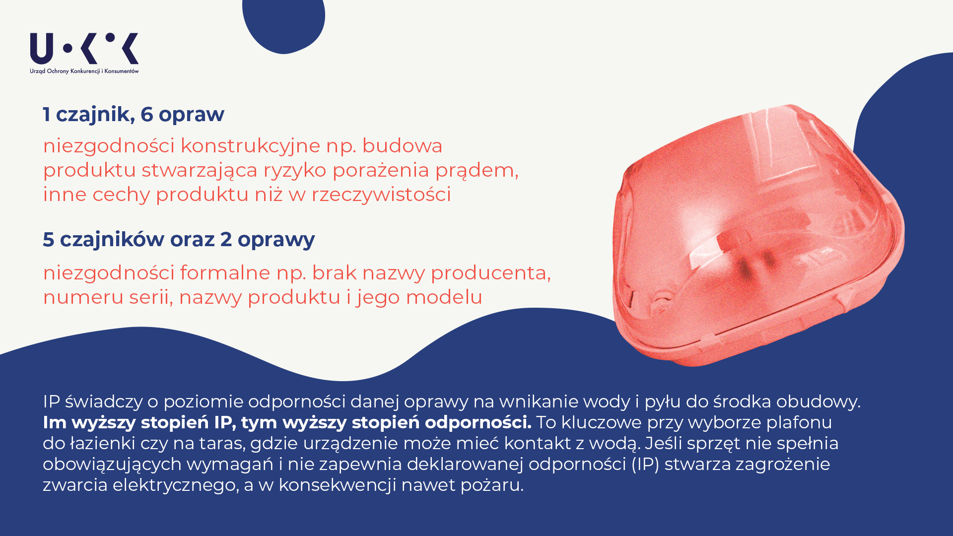- W różnych miastach Polski Inspekcja Handlowa objęła kontrolą wybrany popularny sprzęt elektryczny – 15 rodzajów czajników oraz 15 opraw oświetleniowych, w tym do stosowania w łazienkach – tzw. plafonów. Niektóre z nich nie spełniają ustawowych wymagań dla sprzętu elektrycznego.