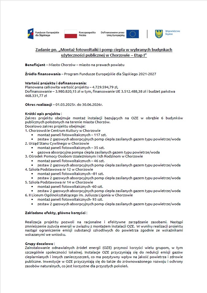 Projekt pn. : Montaż fotowoltaiki i pomp ciepła w wybranych budynkach użyteczności publicznej w Chorzowie – Etap I