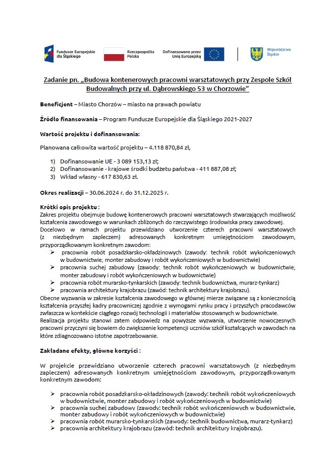 Projekt: Budowa kontenerowych pracowni warsztatowych przy Zespole Szkół Budowalnych przy ul. Dąbrowskiego 53 w Chorzowie
