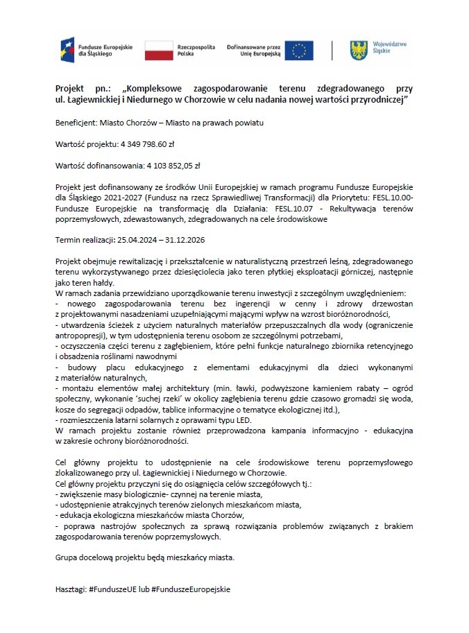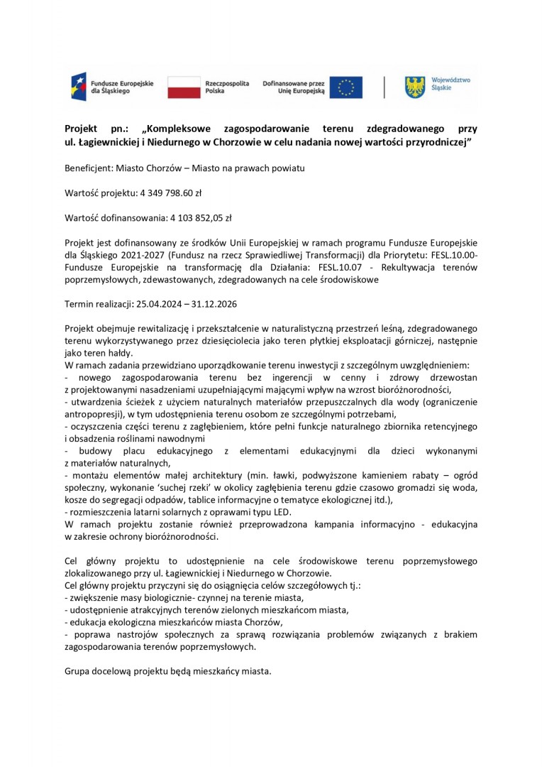 Projekt: Kompleksowe zagospodarowanie terenu zdegradowanego przy ul. Łagiewnickiej i Niedurnego w Chorzowie w celu nadania nowej wartości przyrodniczej
