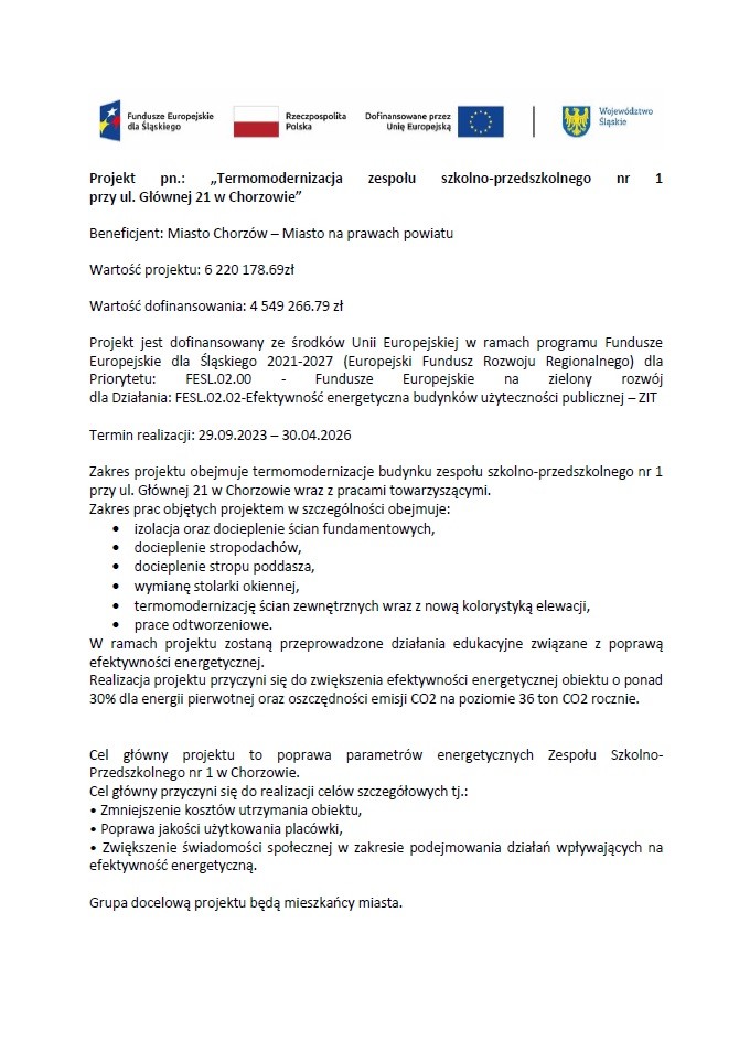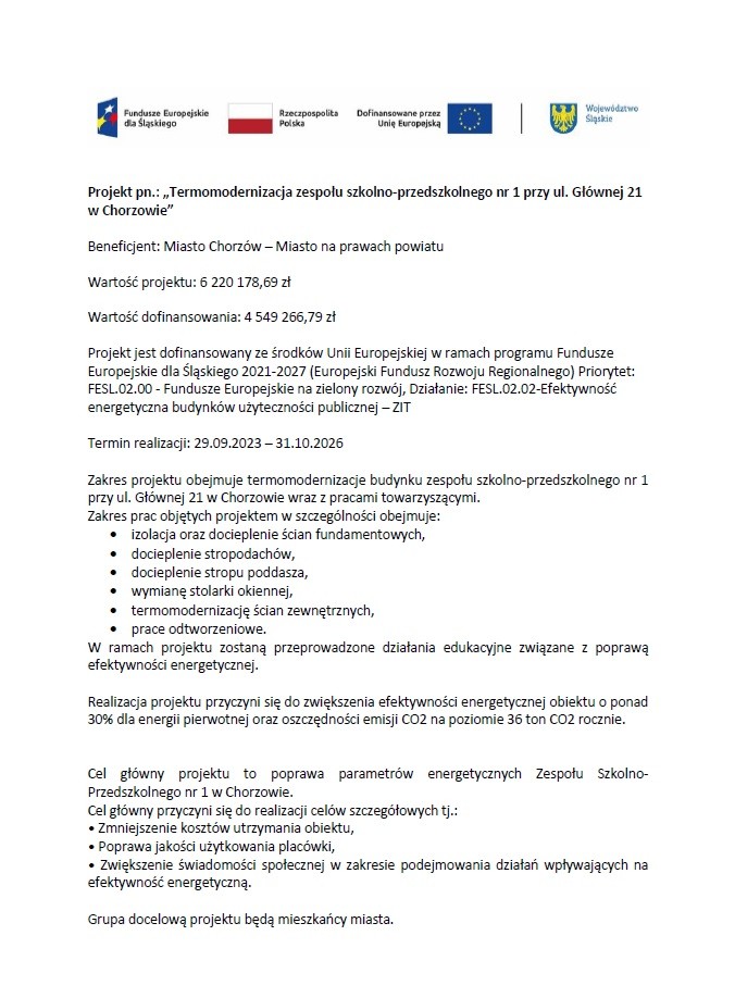 Projekt: Termomodernizacja zespołu szkolno-przedszkolnego nr 1 przy ul. Głównej 21 w Chorzowie