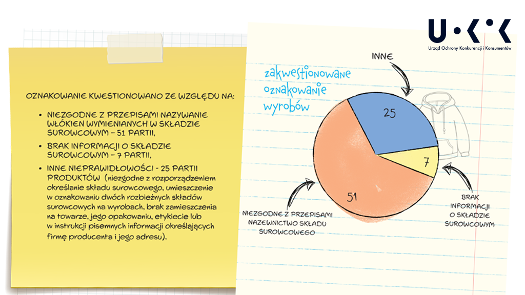W 12 proc. przypadków (81 partii na 684 sprawdzone pod tym kątem) oznakowanie produktów było nieprawidłowe. Najczęstszym błędem było niezgodne z przepisami nazywanie włókien – na przykład „cotton” zamiast „bawełna” i „polyester” zamiast „poliester”. W kilku przypadkach w ogóle nie było informacji o składzie lub był mylący np. zapisany w niewłaściwej kolejności (zgodnie z przepisami powinien być uszeregowany w porządku malejącym) albo występowały różnice w składzie na wszywce i na etykiecie. Brakowało również nazwy i adresu producenta. Wielu przedsiębiorców już w trakcie kontroli usuwało nieprawidłowości w zakresie oznakowania.