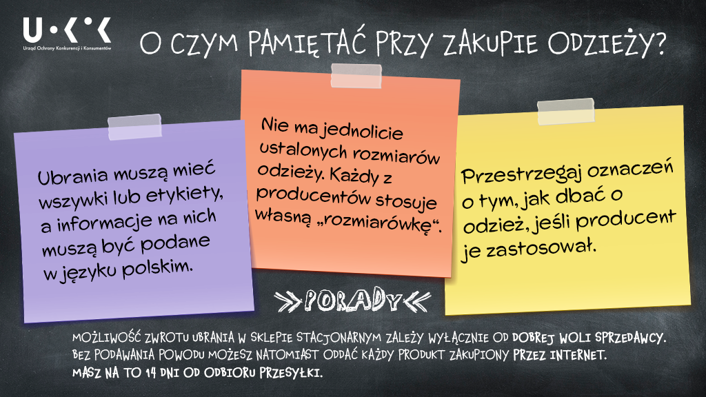 - Nie ma jednolicie ustalonych rozmiarów odzieży, każdy z producentów może stosować własną „rozmiarówkę”. Przed zakupem, przymierz ubranie. Pamiętaj - możliwość zwrotu ubrania w sklepie stacjonarnym, które np. jest za małe, czy za duże, zależy wyłącznie od dobrej woli sprzedawcy. Bez podawania powodu możesz natomiast oddać każdy produkt zakupiony przez internet. Masz na to 14 dni od odbioru przesyłki.