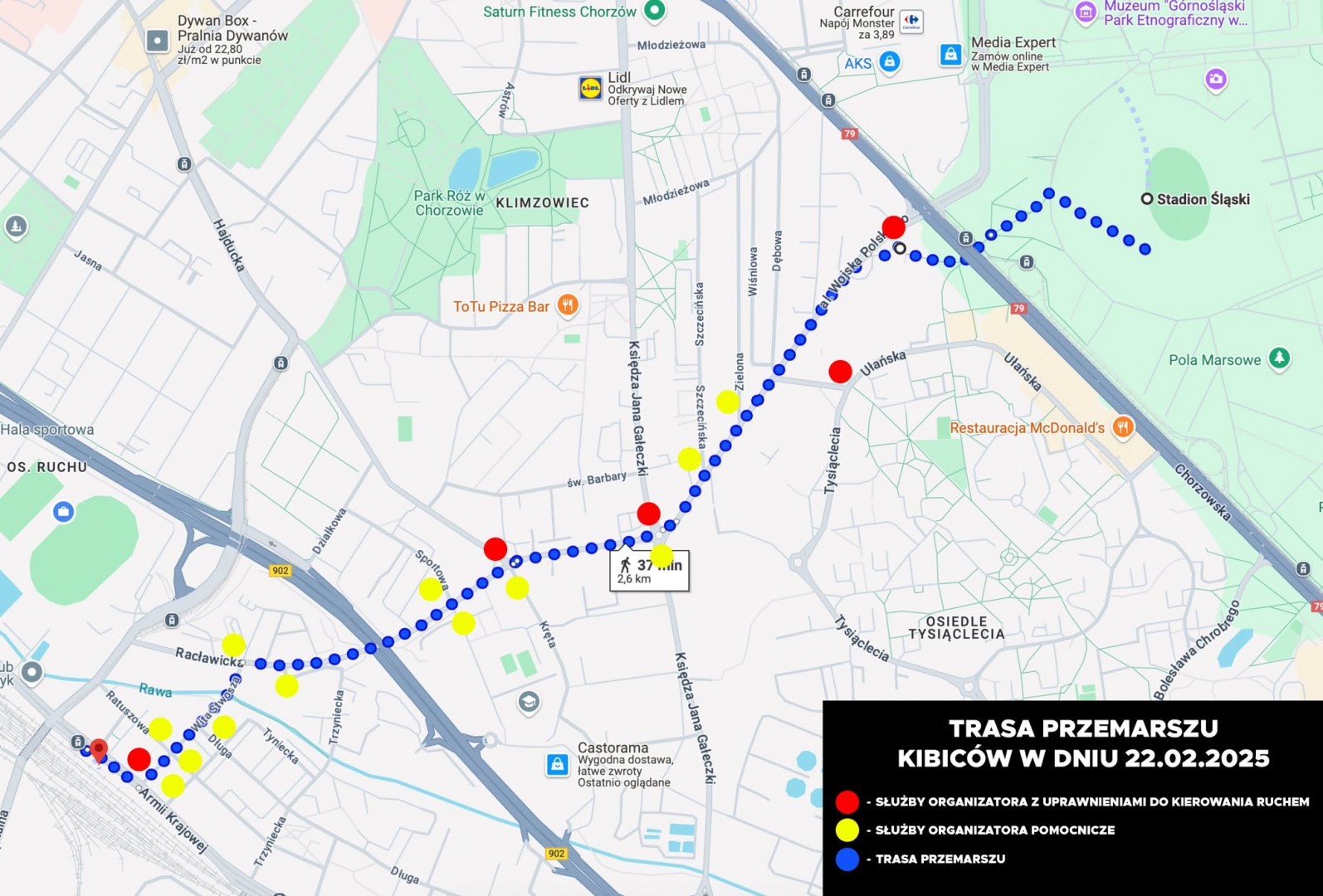 W związku z meczem piłki nożnej, który odbędzie się w sobotę, 22 lutego 2025 r., na Stadionie Śląskim w Chorzowie, na wniosek Policji wprowadzone zostaną następujące zmiany w organizacji ruchu: