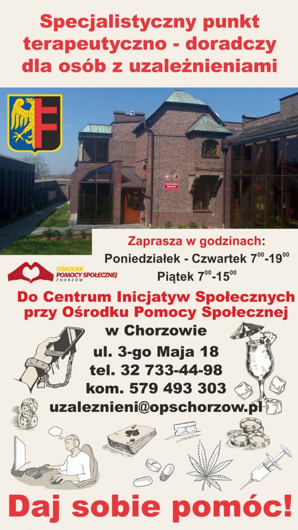 W trosce o zdrowie i bezpieczeństwo mieszkańców Chorzowa przypominamy o działalności Specjalistycznego punktu terapeutyczno-doradczego. Punkt oferuje kompleksowe wsparcie dla osób zmagających się z uzależnieniami oraz ich bliskich.