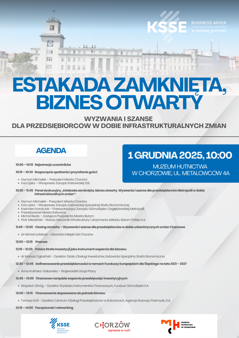 Głównym tematem spotkania będzie dyskusja nad przyszłością Śródmieścia Chorzowa w kontekście powiązań lokalnej przedsiębiorczości z planowanymi zmianami związanymi z estakadą. Z kolei druga część spotkania będzie okazją do zaprezentowania oferty dla przedsiębiorców zamierzających rozwijać swoją działalność gospodarczą przy wsparciu środków zewnętrznych - prelegenci z Katowickiej Specjalnej Strefy Ekonomicznej, Wojewódzkiego Urzędu Pracy, Funduszu Górnośląskiego oraz Agencji Rozwoju Przemysłu omówią możliwości pozyskania wsparcia finansowego z przeznaczeniem na sfinansowanie przedsięwzięć inwestycyjnych.