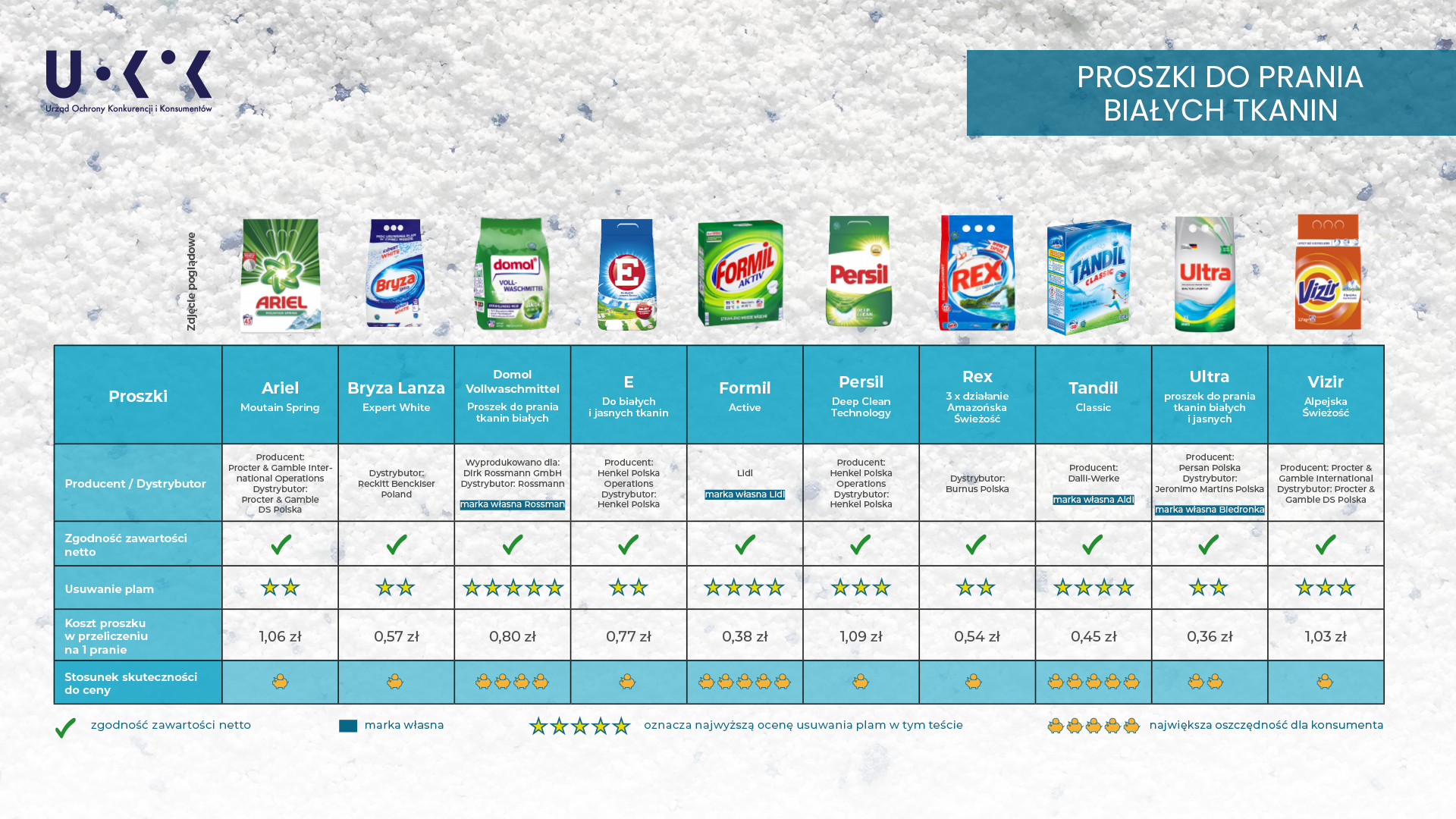 - Prawo do rzetelnej informacji jest jednym z podstawowych praw konsumenckich. Chcemy ułatwić konsumentowi wybór, dostarczyć informacje o jakości produktów i wspierać świadome decyzje zakupowe. Kontynuujemy testowanie różnych produktów codziennego użytku i prezentujemy wyniki badania jakości 10 proszków do prania białych tkanin - mówi Prezes UOKiK Tomasz Chróstny.