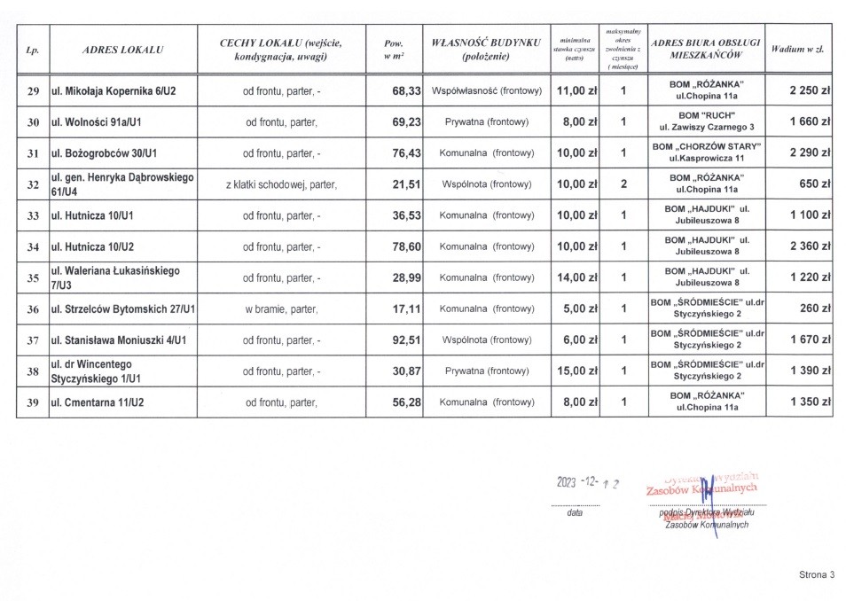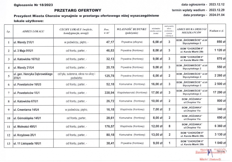 Rozstrzygnięcie przetargu ofertowego odbędzie się w dniu 04.01.2024 r. o godzinie 1000 na Małej Sali Posiedzeń Urzędu Miasta Chorzów