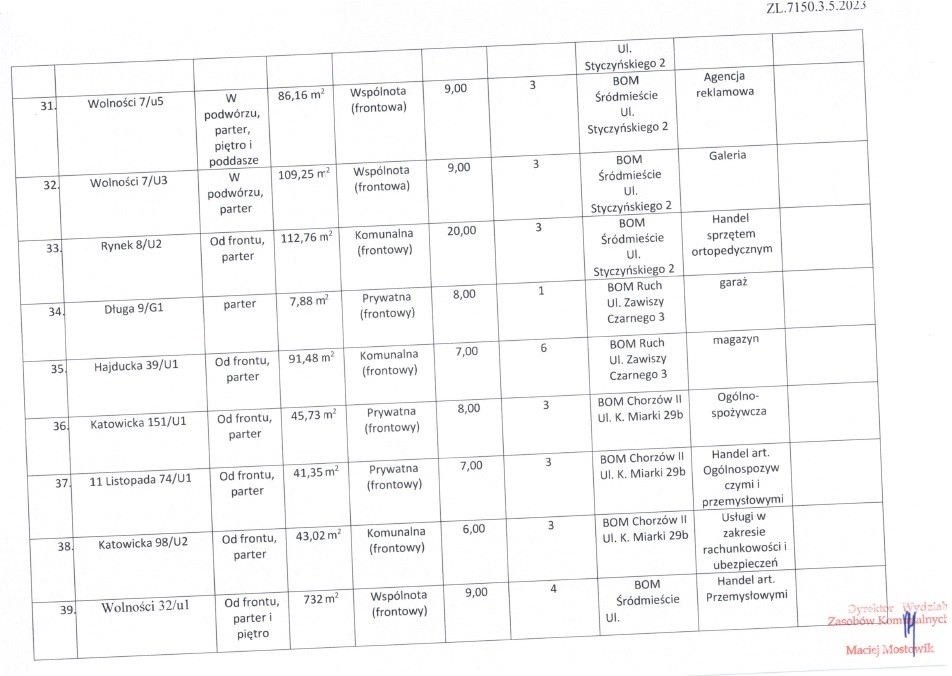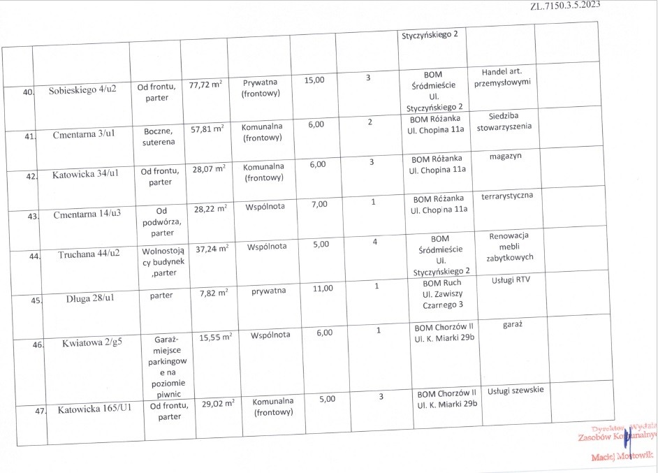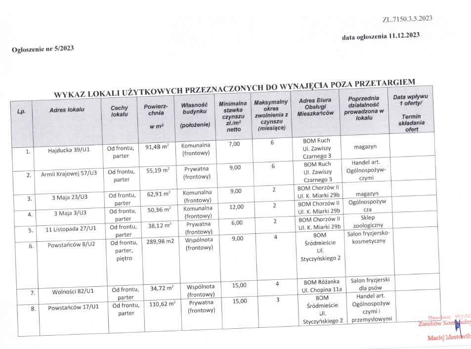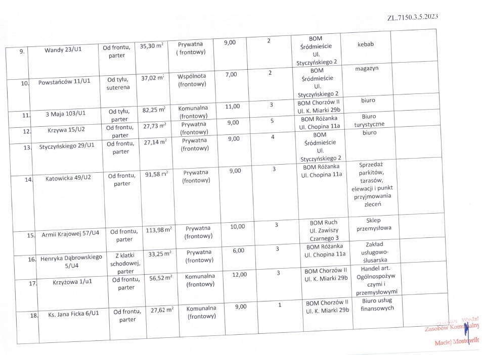 WYKAZ LOKALI UŻYTKOWYCH PRZEZNACZONYCH DO WYNAJĘCIA POZA PRZETARGIEM ogłoszenie nr 5/2023