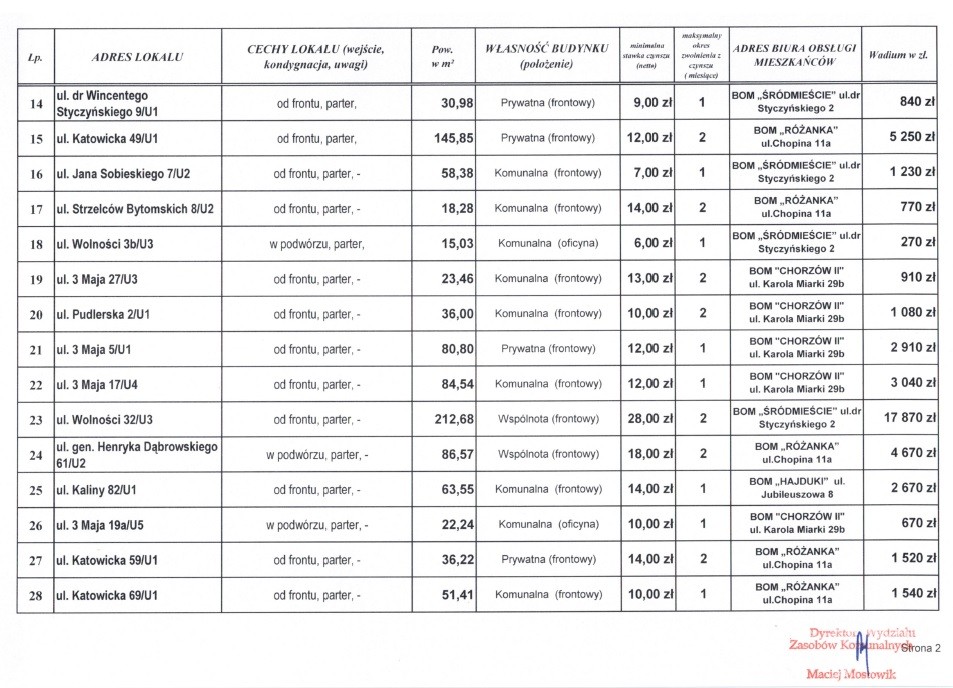 Szczegółowych informacji na temat wszelkich formalności związanych z wynajęciem lokalu użytkowego udziela telefonicznie Wydział Zasobów Komunalnych Urzędu Miasta pod nr tel. 32-416-5000 wew. 5315 lub 695-561-274 dodatkowe informacje są dostępne na stronie www.lokale.chorzow.eu i www.bip.chorzow.eu /zakładka Wydziały, Biura, Stanowiska Samodzielne/ Wydział Zasobów Komunalnych / lokale użytkowe /.